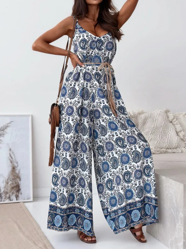 Flower Printed Sleeveless Spaghetti Neck Bohemia Jumpsuits