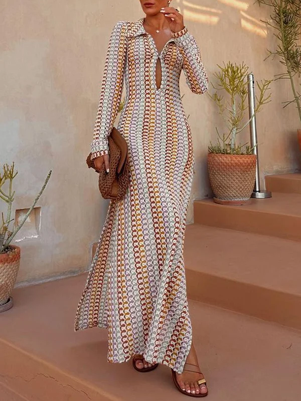 Multicolor Hollow Long Sleeves Bohemia Maxi Dresses