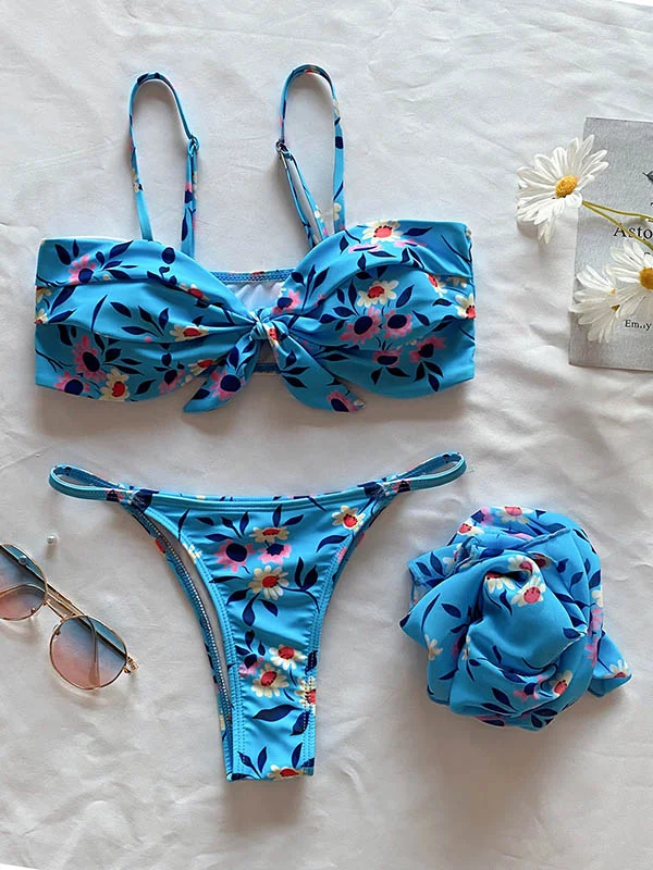 Floral Print Bowknot Split Three-Pieces Bikini Swimsuit