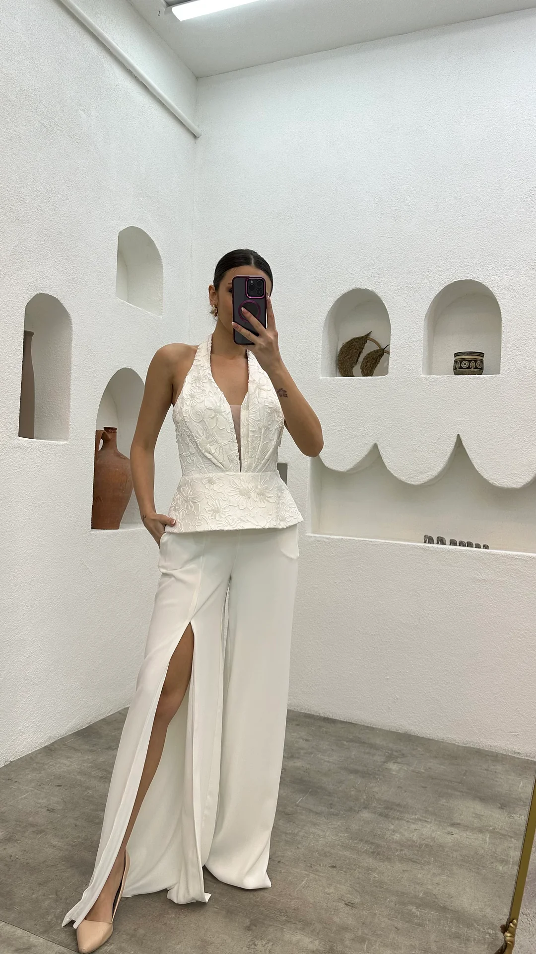 White jumpsuit embroidered with a plaid design.