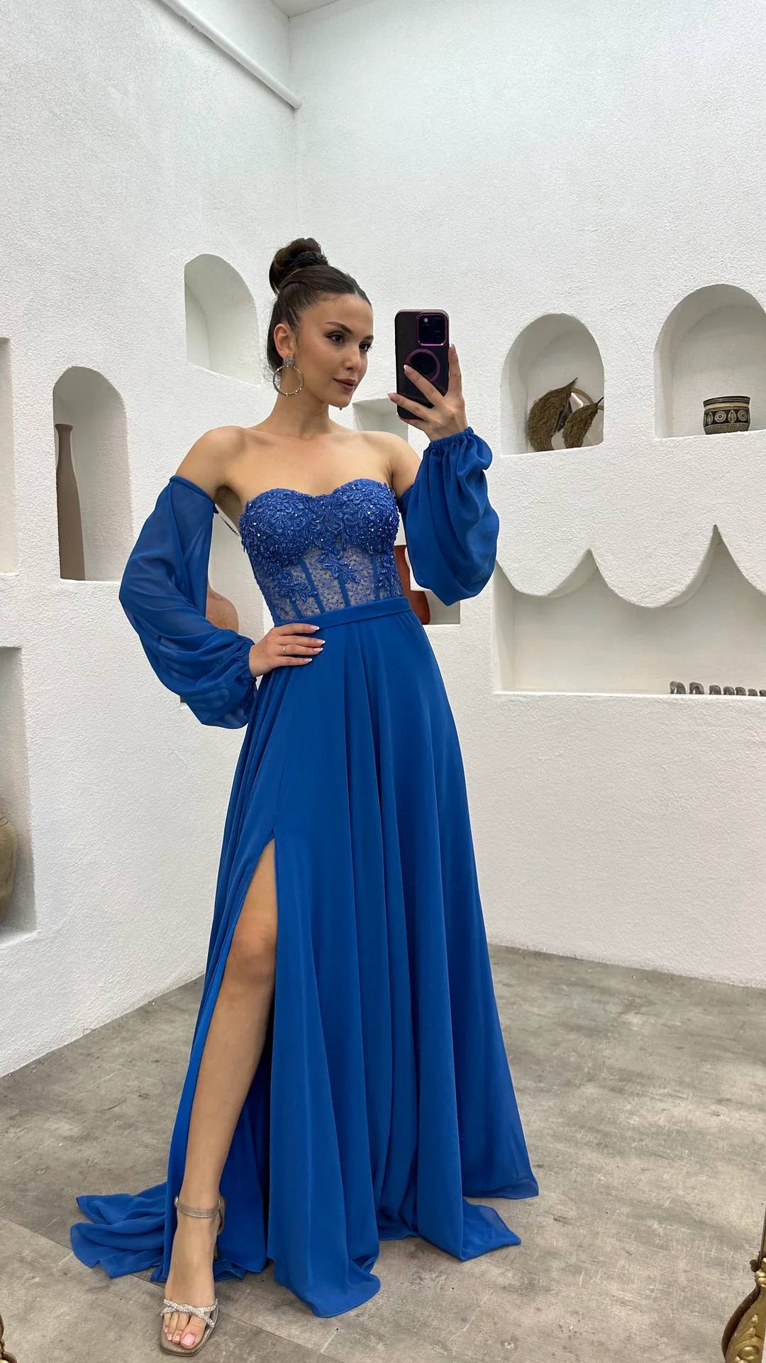 BLUE EMBROIDERED DETAIL CHIFFON EVENING DRESS.